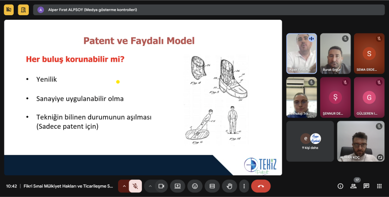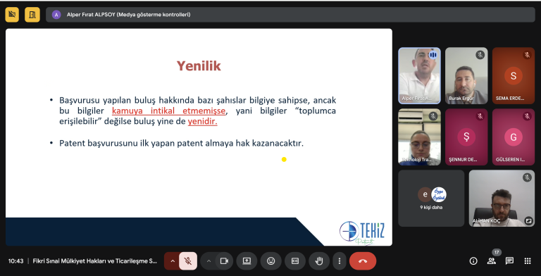 28 Kasım 2025 tarihinde Tekiz Patent Patent Vekili Alper Fırat Alpsoy tarafından gerçekleştirilen eğitimde; fikir, buluş ve telif hakları kavramları, patentlenebilirlik kriterleri, tescil ile kazanılan haklar, patent ve faydalı model süreçleri ile ürün ticarileştirme stratejileri gibi konularda detaylı bilgiler aktarıldı.